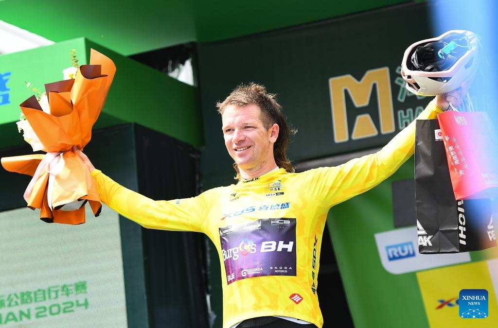 SANYA, 31 agosto, 2024 (Xinhua) -- Aaron Murray Gate del equipo Burgos-BH de Nueva Zelanda festeja con el maillot amarillo al término de la Etapa 5 de la 15 carrera ciclista del Tour de la Isla de Hainan de Changjiang a Sanya, en la provincia de Hainan, en el sur de China, el 31 de agosto de 2024. (Xinhua/Yang Guanyu)