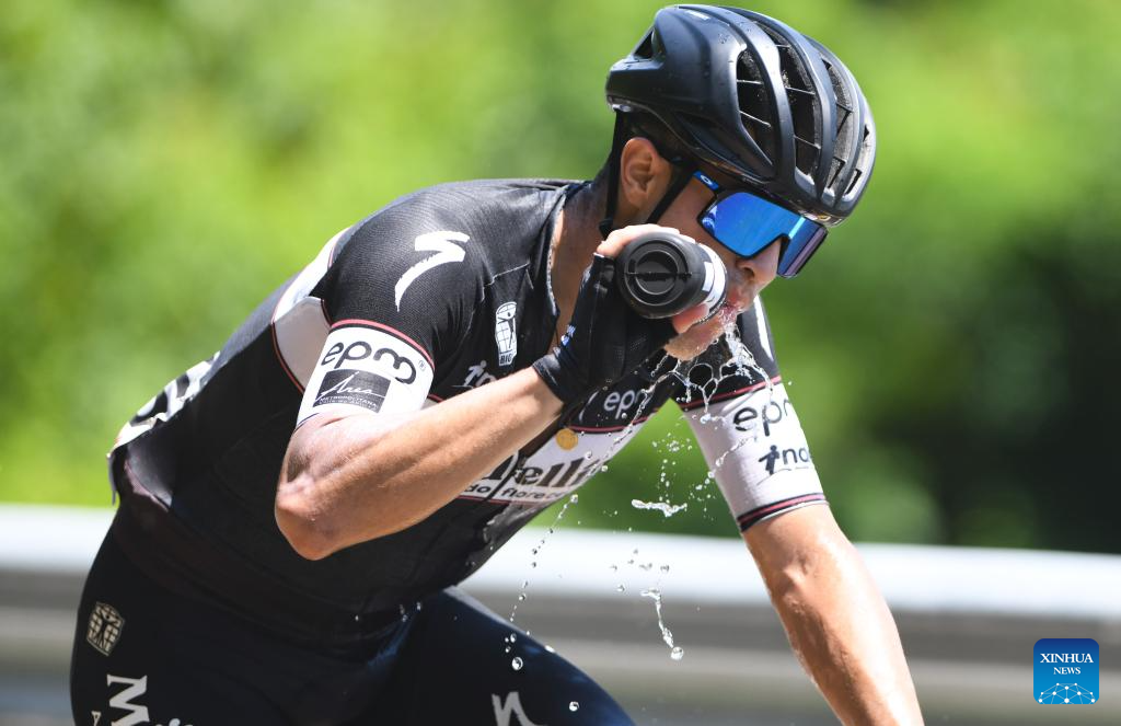 SANYA, 31 agosto, 2024 (Xinhua) -- Víctor Alejandro Ocampo Giraldo de Team Medellín de Colombia bebe agua durante la Etapa 5 de la 15 carrera ciclista del Tour de la Isla de Hainan de Changjiang a Sanya, en la provincia de Hainan, en el sur de China, el 31 de agosto de 2024. (Xinhua/Yang Guanyu)