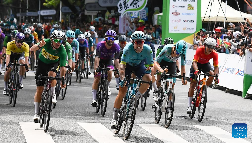 SANYA, 31 agosto, 2024 (Xinhua) -- Ivan Smirnov (frente) del equipo Astana Qazaqstan de Rusia festeja después de cruzar la línea de meta durante la Etapa 5 de la 15 carrera ciclista del Tour de la Isla de Hainan de Changjiang a Sanya, en la provincia de Hainan, en el sur de China, el 31 de agosto de 2024. (Xinhua/Yang Guanyu)
