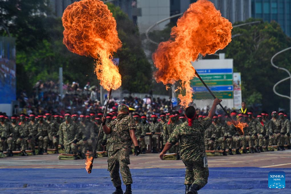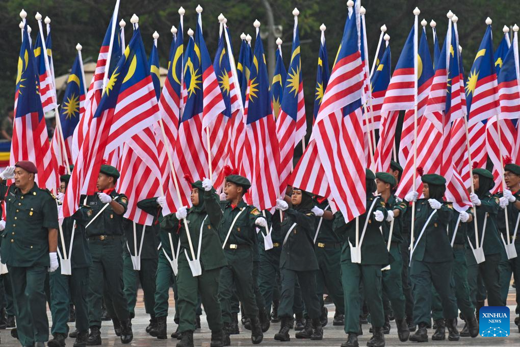 KUALA LUMPUR, 31 agosto, 2024 (Xinhua) -- Soldados malayos realizan una presentación en el evento de celebración del 67 aniversario de la independencia del país, en Putrajaya, Malasia, el 31 de agosto de 2024. Malasia celebró el 67 aniversario de la independencia el sábado, con una gran afluencia de público en el centro administrativo de Putrajaya para conmemorar el Día Nacional. (Xinhua/Chong Voon Chung)