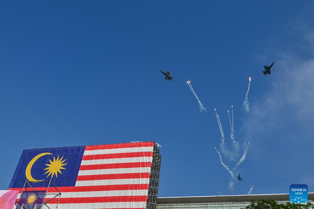 KUALA LUMPUR, 31 agosto, 2024 (Xinhua) -- Un espectáculo aéreo se lleva a cabo en el evento de celebración del 67 aniversario de la independencia de Malasia, en Putrajaya, Malasia, el 31 de agosto de 2024. Malasia celebró el 67 aniversario de la independencia el sábado, con una gran afluencia de público en el centro administrativo de Putrajaya para conmemorar el Día Nacional. (Xinhua/Chong Voon Chung)