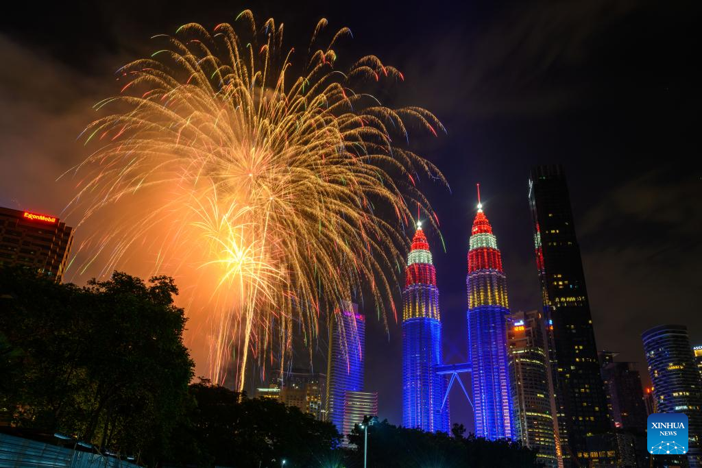 KUALA LUMPUR, 31 agosto, 2024 (Xinhua) -- Fuegos artificiales explotan sobre las Torres Gemelas Petronas en celebración del 67 aniversario de la independencia de Malasia, en Putrajaya, Malasia, el 31 de agosto de 2024. Malasia celebró el 67 aniversario de la independencia el sábado, con una gran afluencia de público en el centro administrativo de Putrajaya para conmemorar el Día Nacional. (Xinhua/Chong Voon Chung)