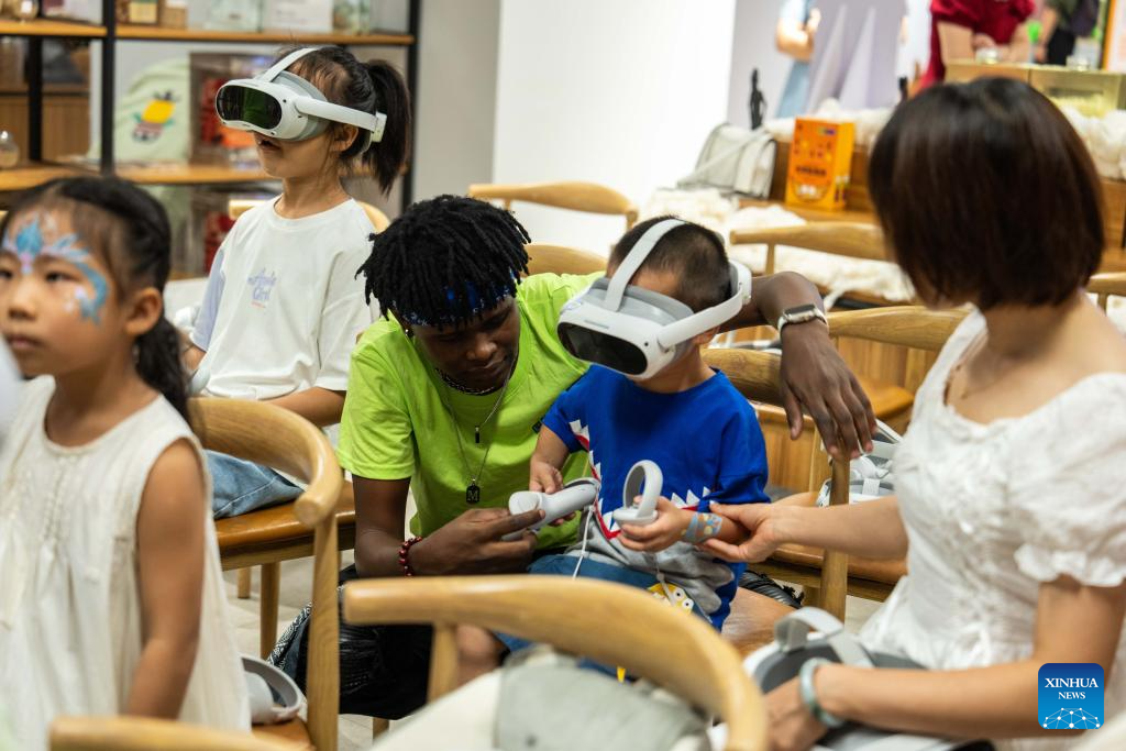CHANGSHA, 31 agosto, 2024 (Xinhua) -- Imagen del 30 de agosto de 2024 de un voluntario ayudando a un niño a colocarse un dispositivo de RV durante una sesión de experiencia práctica en el pabellón de Malí de una sala de exposiciones permanente del Parque de Demostración de Innovación para la Promoción de la Cooperación Económica y Comercial entre China y Africa, en Changsha, en la provincia de Hunan, en el centro de China. Diversas actividades para promover la comunicación entre los jóvenes de China y Africa fueron organizadas aquí durante las vacaciones de verano. Con la ayuda de voluntarios africanos de universidades locales, los estudiantes chinos pudieron sentir el encanto de la cultura africana aprendiendo danza, música y artes folclóricas africanas y realizando viajes inmersivos de costumbres africanas a través de dispositicos de RV. (Xinhua/Chen Sihan)