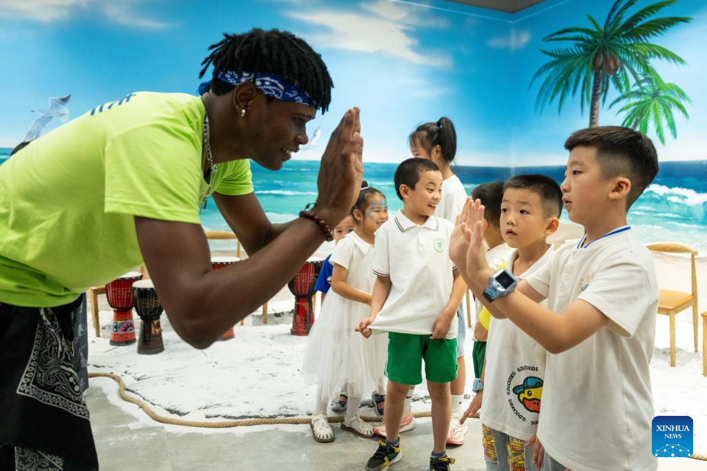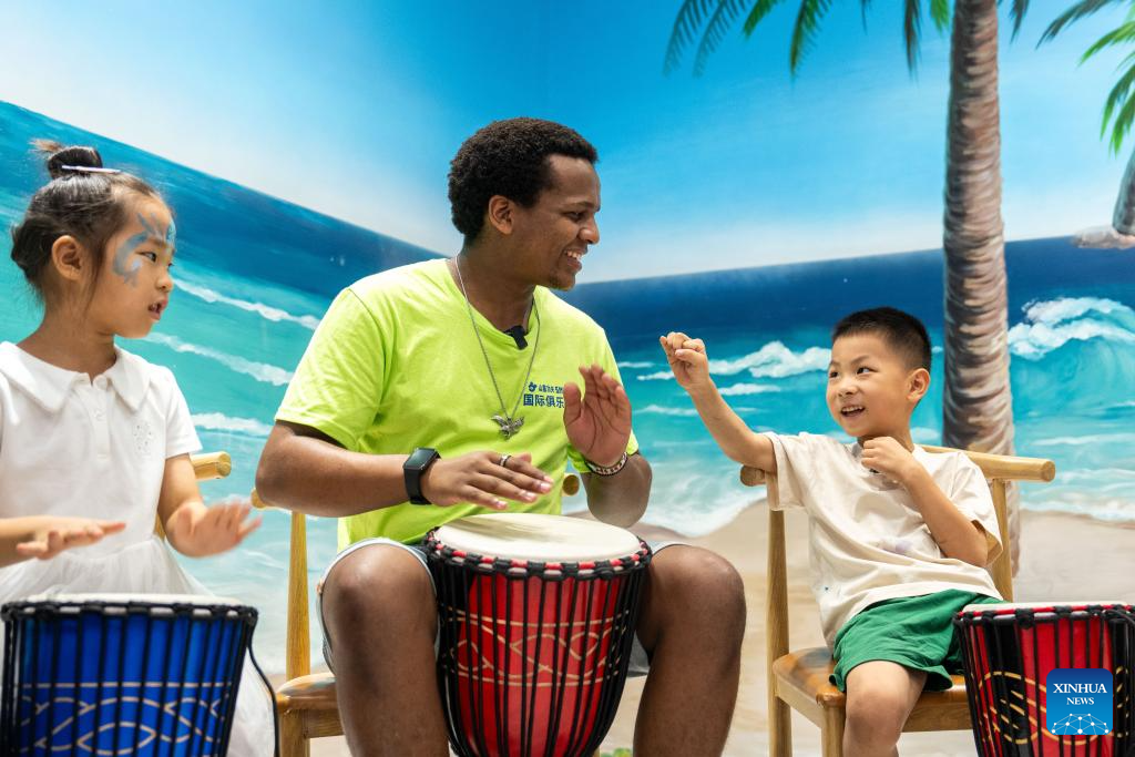 CHANGSHA, 31 agosto, 2024 (Xinhua) -- Imagen del 30 de agosto de 2024 de un voluntario tocando un tambor africano con niños durante una sesión de experiencia práctica en el pabellón de Angola de una sala de exposiciones permanente del Parque de Demostración de Innovación para la Promoción de la Cooperación Económica y Comercial entre China y Africa, en Changsha, en la provincia de Hunan, en el centro de China. Diversas actividades para promover la comunicación entre los jóvenes de China y Africa fueron organizadas aquí durante las vacaciones de verano. Con la ayuda de voluntarios africanos de universidades locales, los estudiantes chinos pudieron sentir el encanto de la cultura africana aprendiendo danza, música y artes folclóricas africanas y realizando viajes inmersivos de costumbres africanas a través de dispositicos de RV. (Xinhua/Chen Sihan)