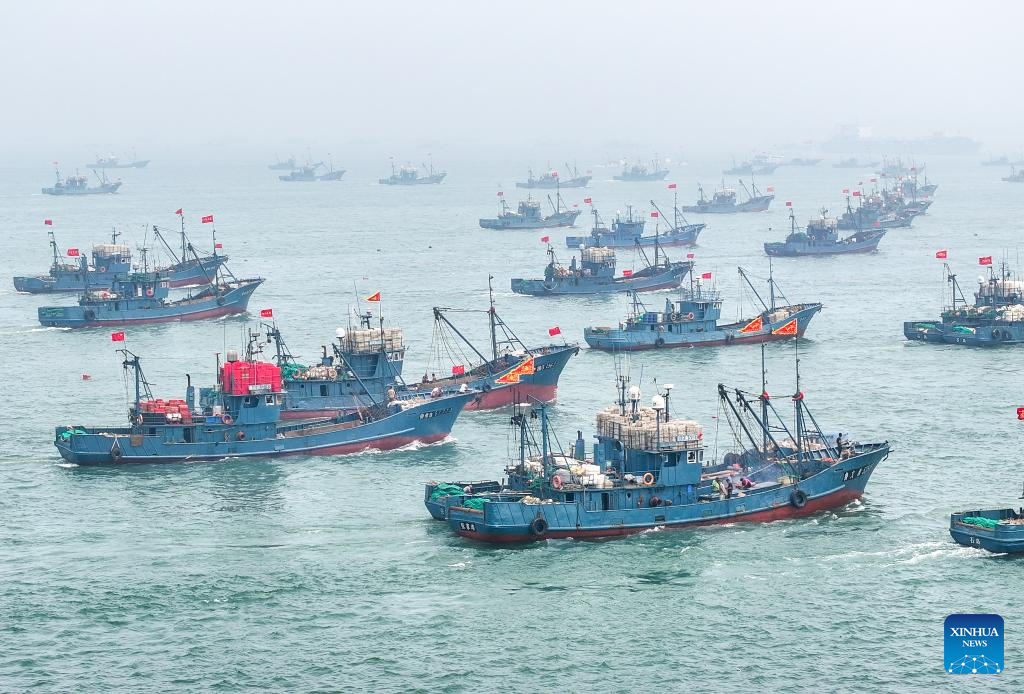 JINAN, 1 septiembre, 2024 (Xinhua) -- Botes pesqueros salen de un puerto para pescar, en la ciudad de Rongcheng de la provincia de Shandong, en el este de China, el 1 de septiembre de 2024. Una nueva ronda de actividades pesqueras comenzó después de que se levantara una prohibición de pesca de cuatro meses en el Mar Amarillo y el Mar de Bohai. (Xinhua/Zhu Zheng)