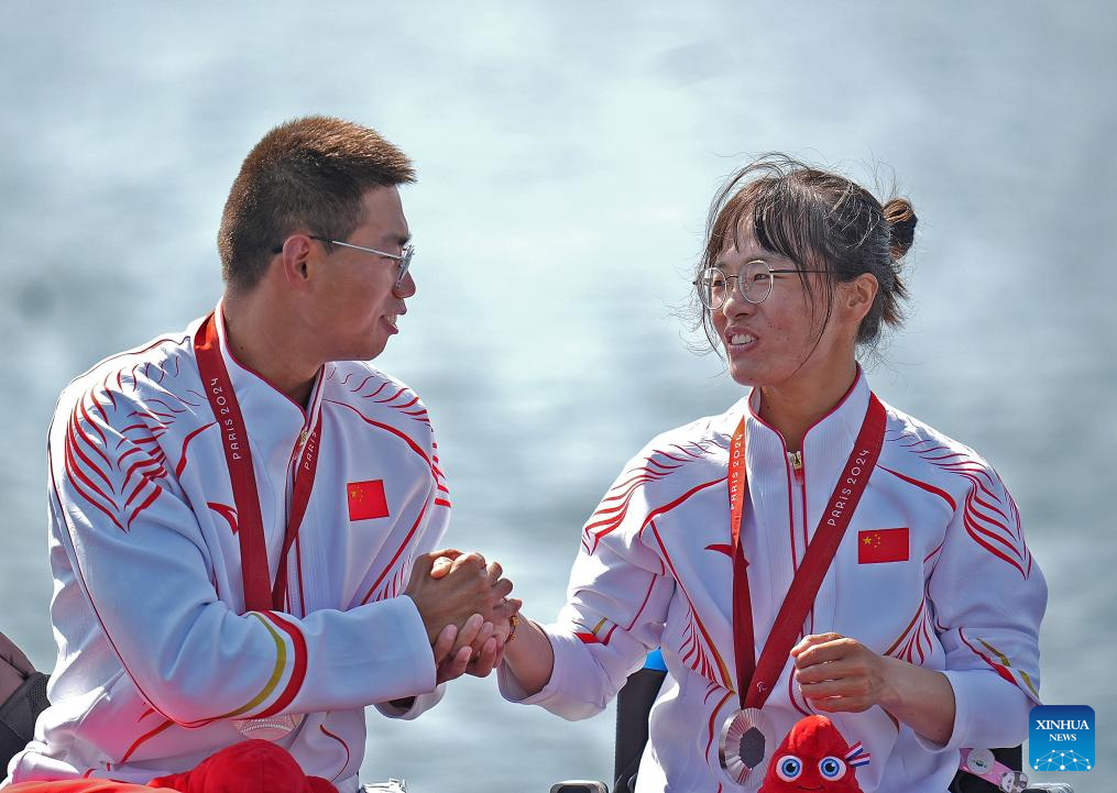 PARIS, 1 septiembre, 2024 (Xinhua) -- Los medallistas de plata Liu Shuang (d)/Jiang Jijian de China festejan durante la ceremonia de premiación del evento de doble remo de PR2 mixto de para remo en los Juegos Paralímpicos de París 2024, en París, Francia, el 1 de septiembre de 2024. (Xinhua/Hou Zhaokang)