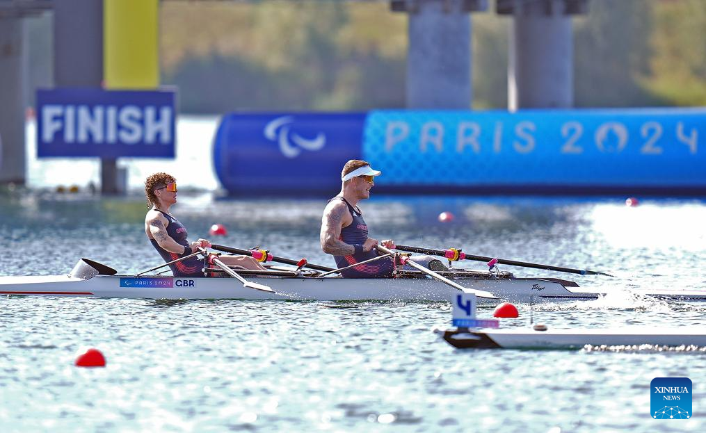 PARIS, 1 septiembre, 2024 (Xinhua) -- Lauren Rowles (i)/Gregg Stevenson de Gran Bretaña compiten durante la final de doble remo de PR2 mixto de para remo en los Juegos Paralímpicos de París 2024, en París, Francia, el 1 de septiembre de 2024. (Xinhua/Hou Zhaokang)