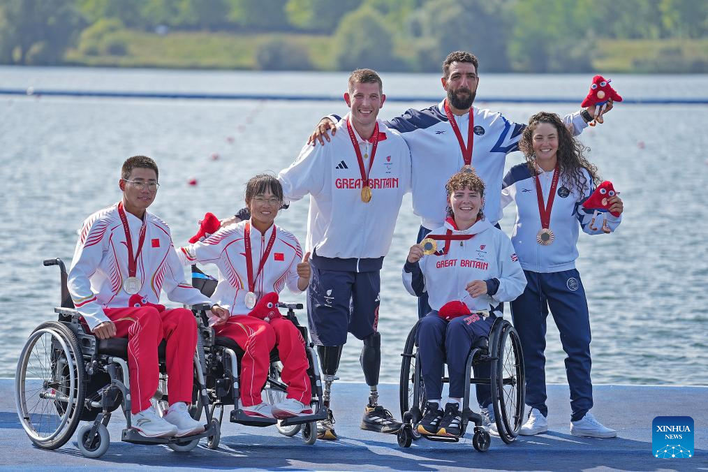 PARIS, 1 septiembre, 2024 (Xinhua) -- Los medallistas de oro Lauren Rowles (d-frente)/Gregg Stevenson (3-i) de Gran Bretaña, los medallistas de plata Liu Shuang (2-i)/Jiang Jijian (i) de China y los medallistas de bronce Shahar Milfelder (d)/Saleh Shahin de Israel posan durante la ceremonia de premiación del evento de doble remo de PR2 mixto de para remo en los Juegos Paralímpicos de París 2024, en París, Francia, el 1 de septiembre de 2024. (Xinhua/Hou Zhaokang)