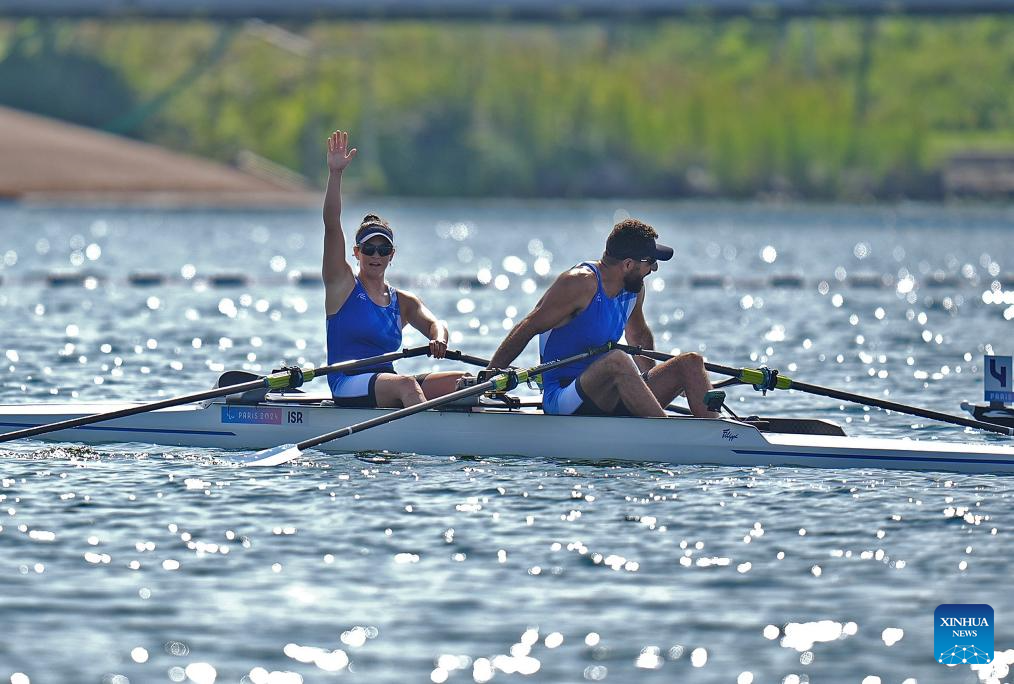 PARIS, 1 septiembre, 2024 (Xinhua) -- Shahar Milfelder (i)/Saleh Shahin de Israel reaccionan al término de la final de doble remo de PR2 mixto de para remo en los Juegos Paralímpicos de París 2024, en París, Francia, el 1 de septiembre de 2024. (Xinhua/Hou Zhaokang)