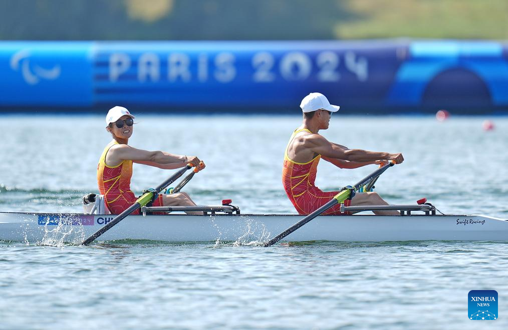 PARIS, 1 septiembre, 2024 (Xinhua) -- Liu Shuang (i)/Jiang Jijian de China compiten durante la final de doble remo de PR2 mixto de para remo en los Juegos Paralímpicos de París 2024, en París, Francia, el 1 de septiembre de 2024. (Xinhua/Hou Zhaokang)
