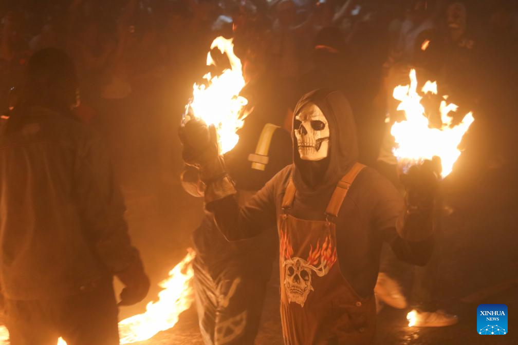SAN SALVADOR, 1 septiembre, 2024 (Xinhua) -- Imagen del 31 de agosto de 2024 de jóvenes portando máscaras mientras sostienen bolas de fuego durante la celebración de 102 años de la tradición de "Las Bolas de Fuego", en el municipio de Nejapa, en el departamento de San Salvador, El Salvador. (Xinhua/Alexander Peña)