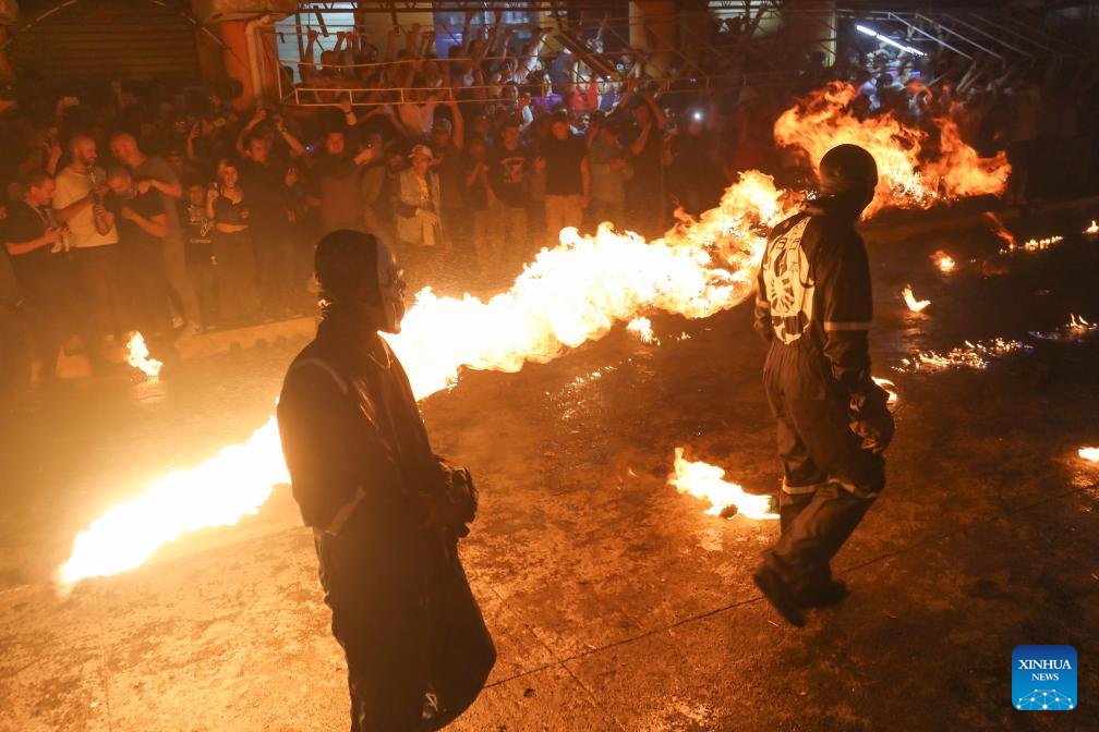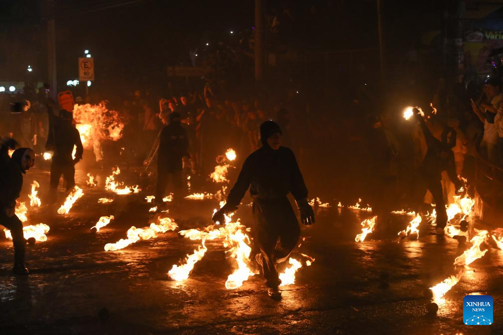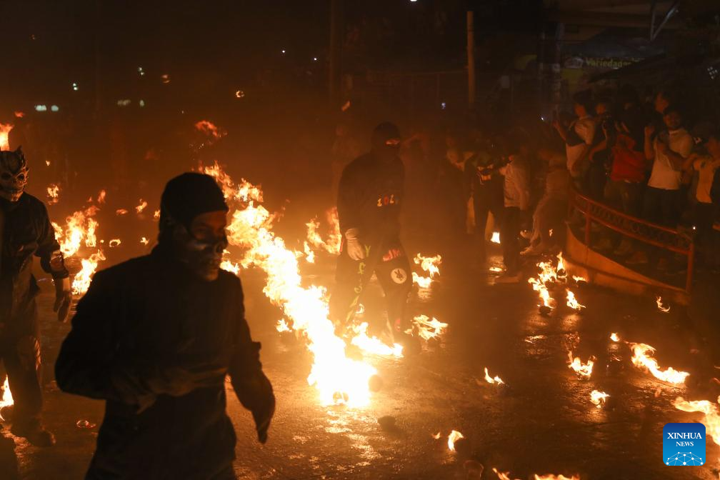 SAN SALVADOR, 1 septiembre, 2024 (Xinhua) -- Imagen del 31 de agosto de 2024 de jóvenes participando en la celebración de 102 años de la tradición de "Las Bolas de Fuego", en el municipio de Nejapa, en el departamento de San Salvador, El Salvador. (Xinhua/Alexander Peña)