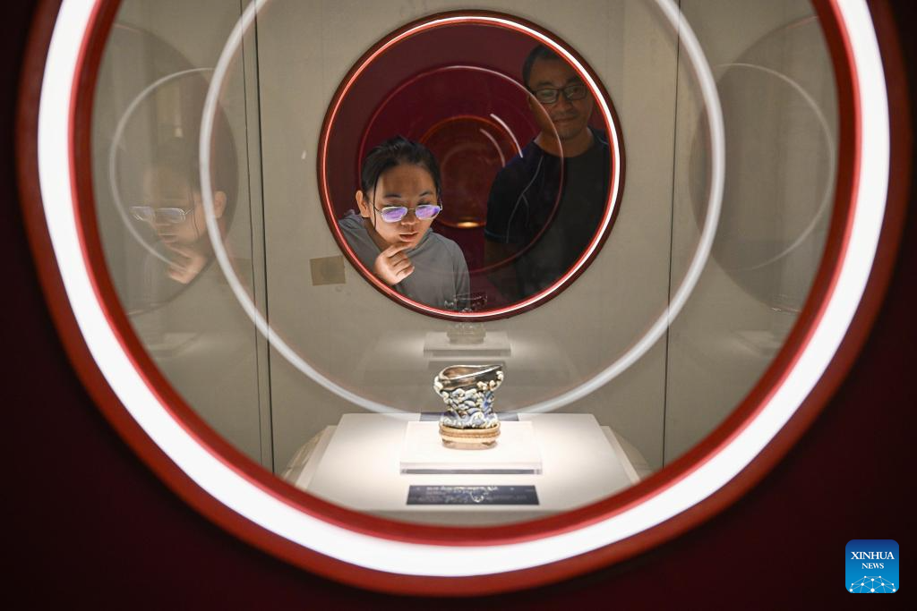 HAIKOU, 1 septiembre, 2024 (Xinhua) -- Imagen del 31 de agosto de 2024 de visitantes observando una pieza exhibida en una exposición especial en el Museo de Hainan, en Haikou, en la provincia de Hainan, en el sur de China. Una exposición que muestra las reliquias culturales de Hainan recolectadas por el Museo del Palacio se lleva a cabo en el Museo de Hainan. Un total de 96 piezas con características de Hainan son exhibidas, incluyendo muebles tradicionales, adornos y artículos de papelería, etcétera. (Xinhua/Pu Xiaoxu)
