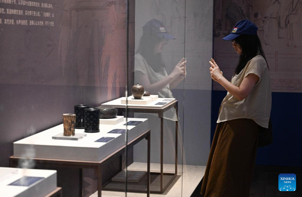 HAIKOU, 1 septiembre, 2024 (Xinhua) -- Imagen del 31 de agosto de 2024 de una visitante tomando fotografías de las piezas exhibidas en el Museo de Hainan, en Haikou, en la provincia de Hainan, en el sur de China. Una exposición que muestra las reliquias culturales de Hainan recolectadas por el Museo del Palacio se lleva a cabo en el Museo de Hainan. Un total de 96 piezas con características de Hainan son exhibidas, incluyendo muebles tradicionales, adornos y artículos de papelería, etcétera. (Xinhua/Pu Xiaoxu)