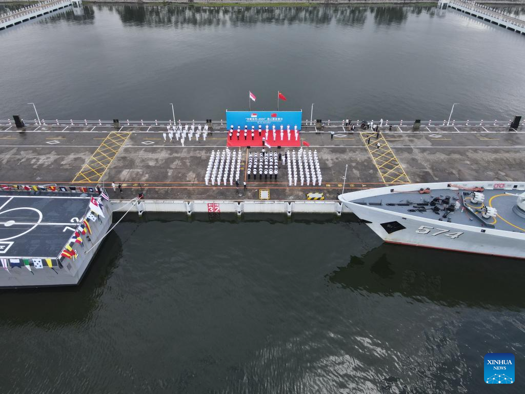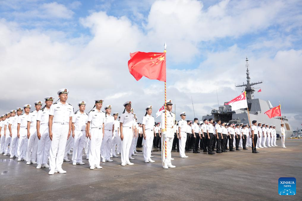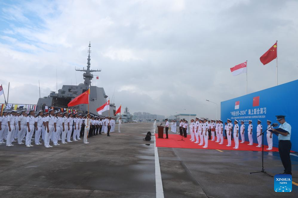 ZHANJIANG, 1 septiembre, 2024 (Xinhua) -- Imagen del 1 de septiembre de 2024 de la ceremonia de apertura del Ejercicio de Cooperación China-Singapur 2024 cerca de Zhanjiang, en la provincia de Guangdong, en el sur de China. El Ejercicio de Cooperación China-Singapur 2024 es el primer simulacro conjunto bilateral organizado en China entre las Armadas de los dos países. (Xinhua/Wang Wenbin)