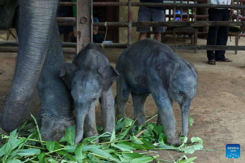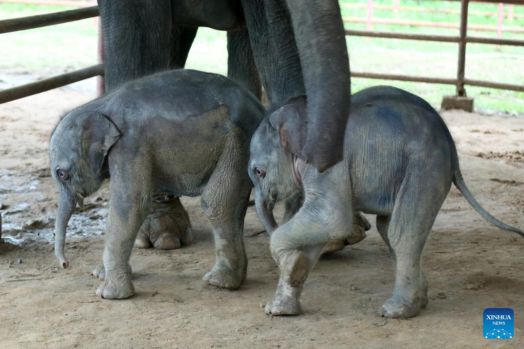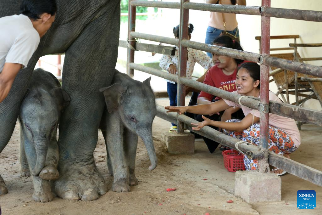 BAGO, 1 septiembre, 2024 (Xinhua) -- Los elefantes bebés gemelos son vistos en el campamento de elefantes de Wingabaw, en la región de Bado, Myanmar, el 1 de septiembre de 2024. Un raro caso de elefantes gemelos, un macho y una hembra, se registró en la región de Bago, en el sur de Myanmar. El 26 de agosto, una elefanta de 21 años llamada Pearl Sandar dió a luz a los gemelos en el campamento de elefantes de Wingabaw. La primera cría, una hembra, nació seguida por un macho unos cuatro minutos después, dijo a Xinhua el domingo Myo Min Aung, un veterinario del campamento. (Xinhua/Myo Kyaw Soe)