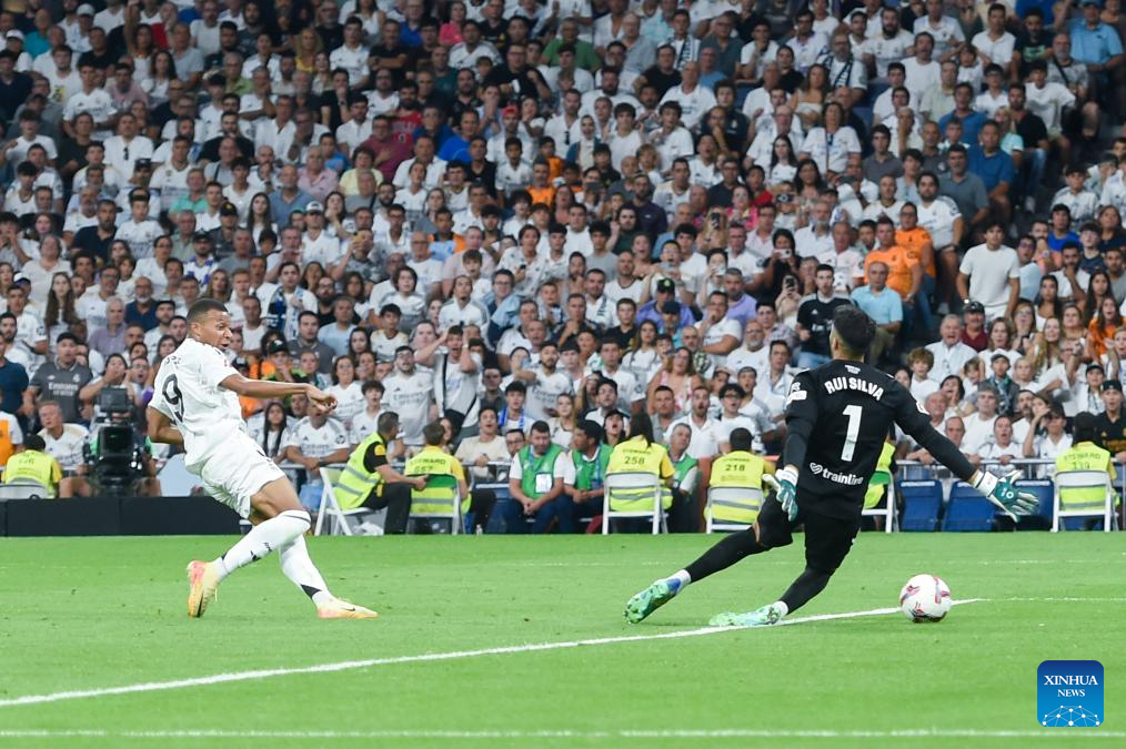 MADRID, 2 septiembre, 2024 (Xinhua) -- Imagen del 1 de septiembre de 2024 del jugador Kylian Mbappe, de Real Madrid, marcando su primera anotación durante el partido de fútbol de LaLiga, entre Real Madrid y Real Betis, en el estadio Santiago Bernabéu, en Madrid, España. (Xinhua/Gustavo Valiente)