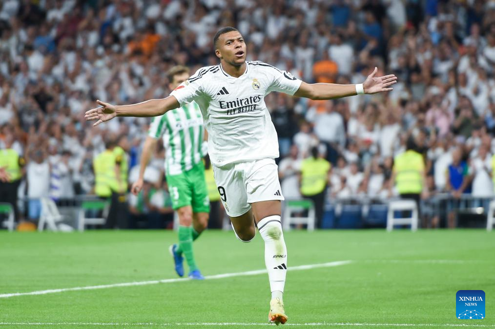 MADRID, 2 septiembre, 2024 (Xinhua) -- Imagen del 1 de septiembre de 2024 del jugador Kylian Mbappe, de Real Madrid, festejando su anotación durante el partido de fútbol de LaLiga, entre Real Madrid y Real Betis, en el estadio Santiago Bernabéu, en Madrid, España. (Xinhua/Gustavo Valiente)