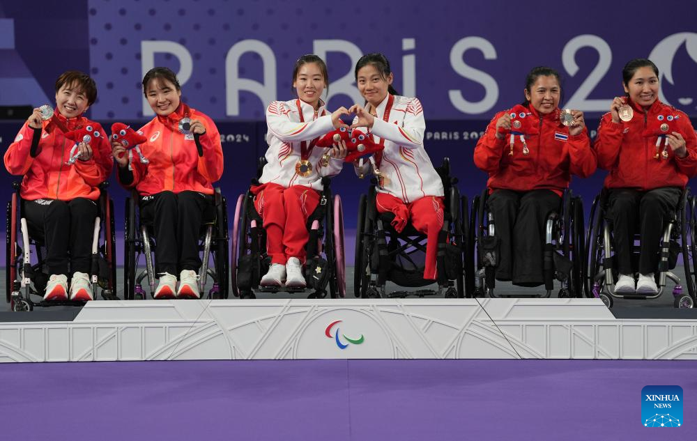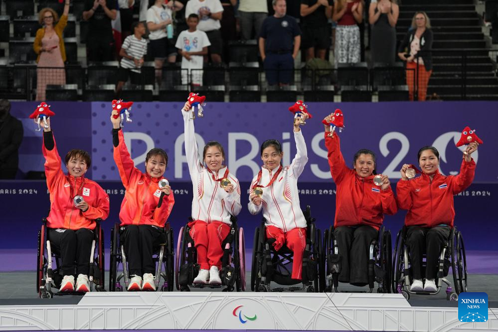 PARIS, 2 septiembre, 2024 (Xinhua) -- Las medallistas de oro Liu Yutong (3-d)/Yin Menglu (3-i) de China, las medallistas de plata Satomi Sarina (2-i)/Yamazaki Yuma (i) de Japón y las medallistas de bronce Sujirat Pookkham (d)/Amnouy Wetwithan de Tailandia reaccionan durante la ceremonia de premiación para el evento de dobles femeninos de WH1-WH2 de para bádminton en los Juegos Paralímpicos de París 2024, en París, Francia, el 2 de septiembre de 2024. (Xinhua/Xing Guangli)