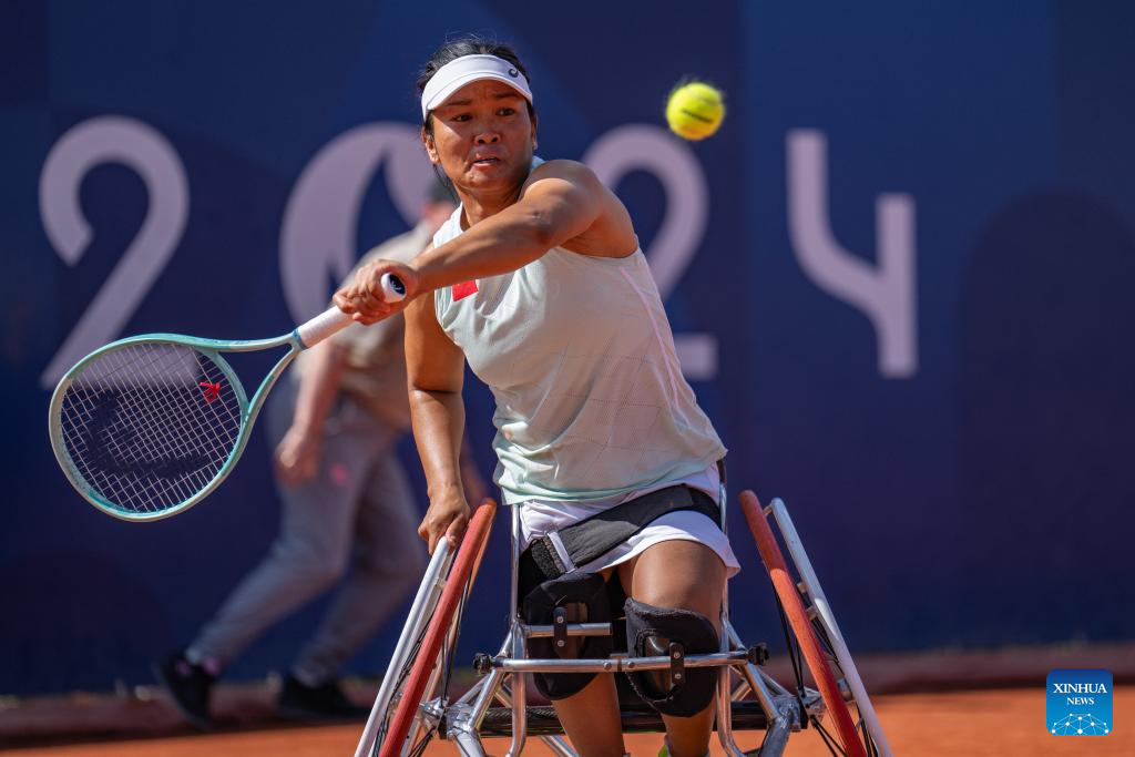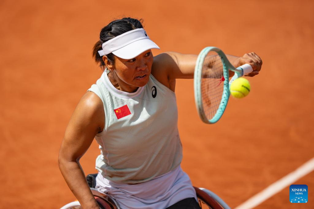 PARIS, 2 septiembre, 2024 (Xinhua) -- Zhu Zhenzhen de China devuelve la pelota a Macarena Cabrillana de Chile durante el partido de segunda ronda de individuales femeninos de tenis en silla de ruedas en los Juegos Paralímpicos de París 2024, en París, Francia, el 2 de septiembre de 2024. (Xinhua/Huang Wei)