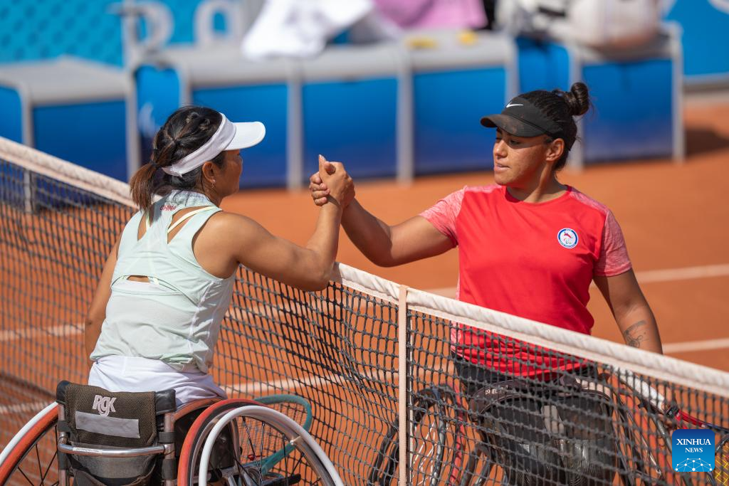PARIS, 2 septiembre, 2024 (Xinhua) -- Zhu Zhenzhen (i) de China estrecha la mano de Macarena Cabrillana de Chile al término del partido de segunda ronda de individuales femeninos de tenis en silla de ruedas en los Juegos Paralímpicos de París 2024, en París, Francia, el 2 de septiembre de 2024. (Xinhua/Huang Wei)