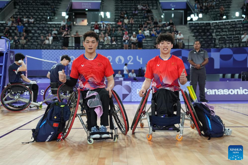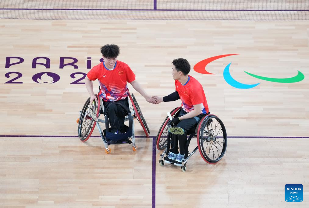 PARIS, 2 septiembre, 2024 (Xinhua) -- Imagen del 1 de septiembre de 2024 de Mai Jianpeng/Qu Zimo (i) de China reaccionando durante el partido por la medalla de oro de WH1-WH2 de dobles masculinos de para bádminton ante Jeong Jaegun/Yu Sooyoung de República de Corea en los Juegos Paralímpicos de París 2024, en París, Francia. (Xinhua/He Canling)