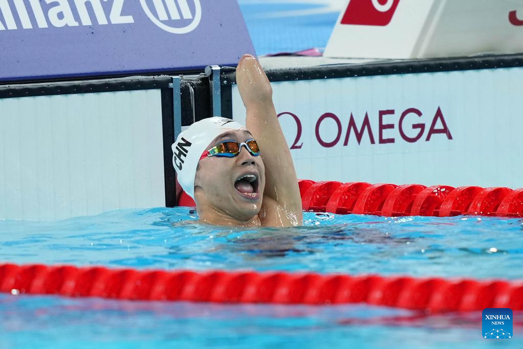PARIS, 2 septiembre, 2024 (Xinhua) -- Imagen del 1 de septiembre de 2024 de Yang Hong de China festejando después de ganar la final de 100m braza de SB6 masculinos de para natación en los Juegos Paralímpicos de París 2024, en París, Francia. (Xinhua/Zhang Haofu)