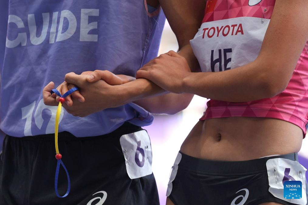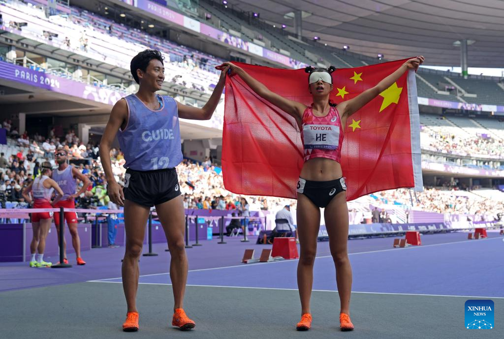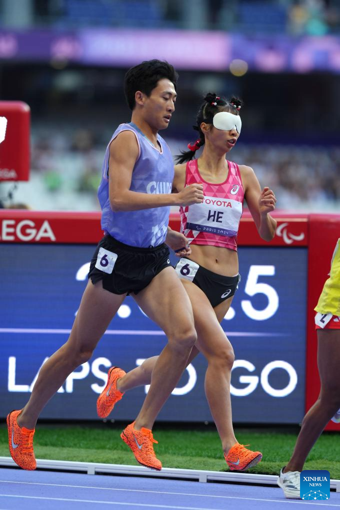 PARIS, 2 septiembre, 2024 (Xinhua) -- He Shanshan (d) de China y su guía You Junjie compiten durante la final de 1500m de T11 femenino de para atletismo en los Juegos Paralímpicos de París 2024, en París, Francia, el 2 de septiembre de 2024. (Xinhua/Cai Yang)