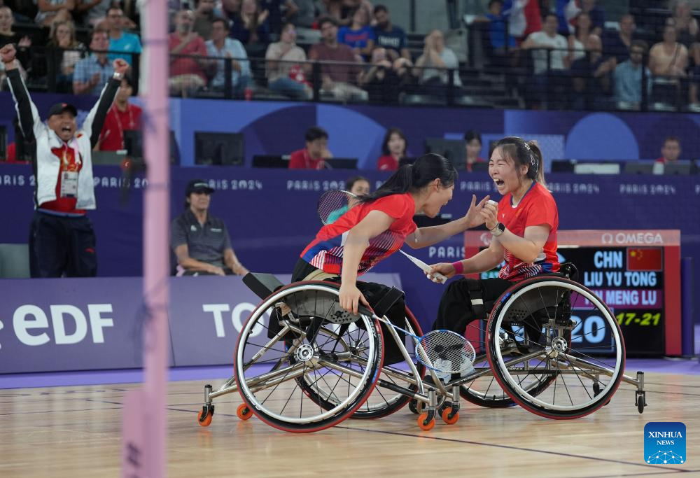 PARIS, 2 septiembre, 2024 (Xinhua) -- Imagen del 1 de septiembre de 2024 de Liu Yutong/Yin Menglu (i) de China festejando al término del partido por la medalla de oro de dobles femeninos de WH1-WH2 de para bádminton ante Satomi Sarina/Yamazaki Yuma de Japón en los Juegos Paralímpicos de París 2024, en París, Francia. (Xinhua/He Canling)