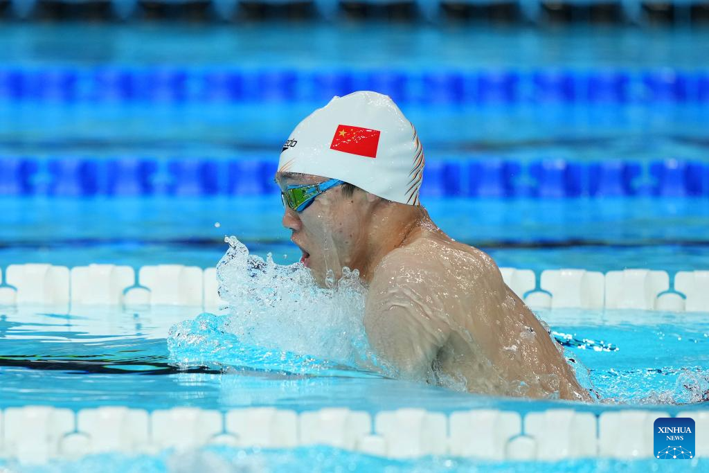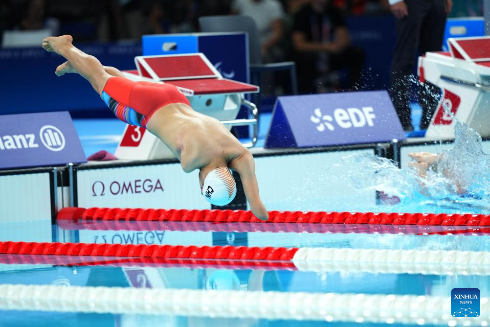 PARIS, 2 septiembre, 2024 (Xinhua) -- Imagen del 1 de septiembre de 2024 de Yang Hong de China compitiendo durante la final de 100m braza de SB6 masculinos de para natación en los Juegos Paralímpicos de París 2024, en París, Francia. (Xinhua/Zhang Haofu)