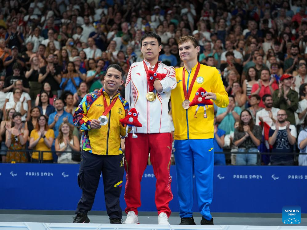 PARIS, 2 septiembre, 2024 (Xinhua) -- Imagen del 1 de septiembre de 2024 de Yang Hong (c) de China, Nelson Crispín Corzo (i) de Colombia y Yevhenii Bohodaiko de Ucrania posando para una fotografía grupal durante la ceremonia de premiación de 100m braza de SB6 masculinos de para natación en los Juegos Paralímpicos de París 2024, en París, Francia. (Xinhua/Zhang Haofu)