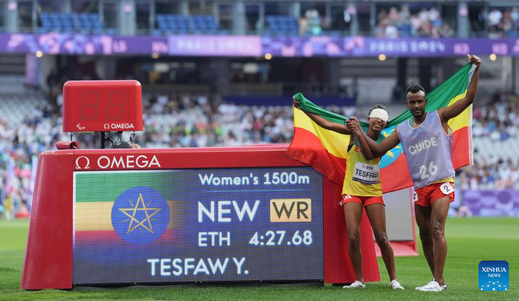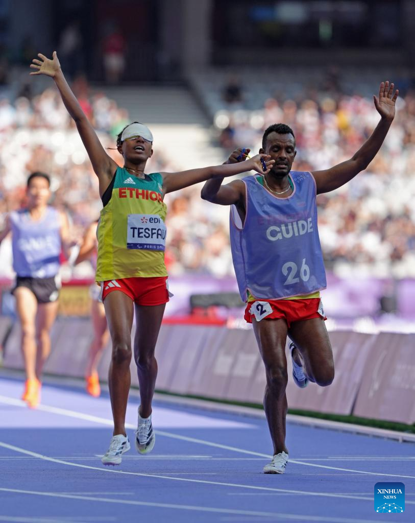 PARIS, 2 septiembre, 2024 (Xinhua) -- Yayesh Gate Tesfaw (i) de Etiopía y su guía Kindu Sisay Girma festejan luego de la final de 1500m de T11 femenino de para atletismo en los Juegos Paralímpicos de París 2024, en París, Francia, el 2 de septiembre de 2024. (Xinhua/Cai Yang)