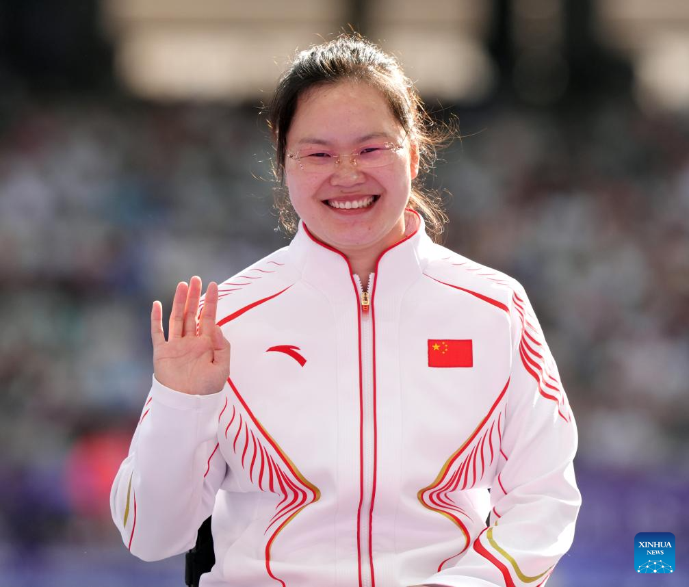 PARIS, 2 septiembre, 2024 (Xinhua) -- La medallista de oro Zou Lijuan de China posa para fotografías durante la ceremonia de premiación del lanzamiento de jabalina de F34 femenino de para atletismo en los Juegos Paralímpicos de París 2024, en París, Francia, el 2 de septiembre de 2024. (Xinhua/Cai Yang)