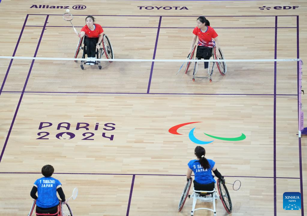 PARIS, 2 septiembre, 2024 (Xinhua) -- Imagen del 1 de septiembre de 2024 de Liu Yutong (d-arriba)/Yin Menglu (i-arriba) de China compitiendo durante el partido por la medalla de oro de dobles femeninos de WH1-WH2 de para bádminton ante Satomi Sarina/Yamazaki Yuma de Japón en los Juegos Paralímpicos de París 2024, en París, Francia. (Xinhua/He Canling)