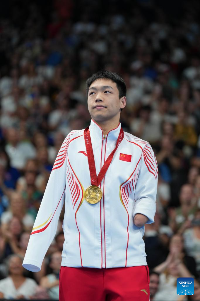 PARIS, 2 septiembre, 2024 (Xinhua) -- Imagen del 1 de septiembre de 2024 de Yang Hong de China reaccionando durante la ceremonia de premiación de 100m braza de SB6 masculinos de para natación en los Juegos Paralímpicos de París 2024, en París, Francia. (Xinhua/Zhang Haofu)