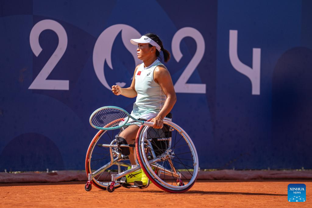 PARIS, 2 septiembre, 2024 (Xinhua) -- Zhu Zhenzhen de China reacciona mientras compite ante Macarena Cabrillana de Chile durante el partido de segunda ronda de individuales femeninos de tenis en silla de ruedas en los Juegos Paralímpicos de París 2024, en París, Francia, el 2 de septiembre de 2024. (Xinhua/Huang Wei)
