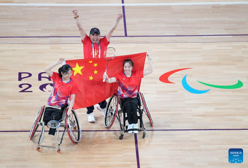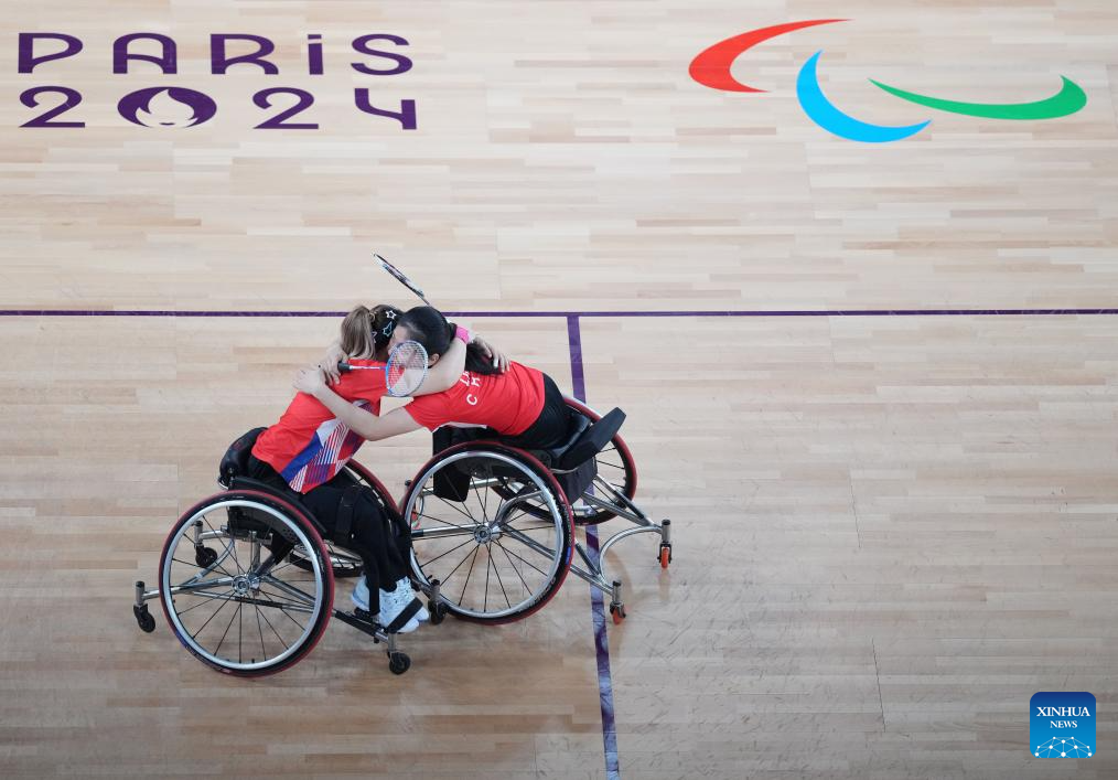 PARIS, 2 septiembre, 2024 (Xinhua) -- Imagen del 1 de septiembre de 2024 de Liu Yutong (i)/Yin Menglu de China festejando al término del partido por la medalla de oro de dobles femeninos de WH1-WH2 de para bádminton ante Satomi Sarina/Yamazaki Yuma de Japón en los Juegos Paralímpicos de París 2024, en París, Francia. (Xinhua/Xing Guangli)