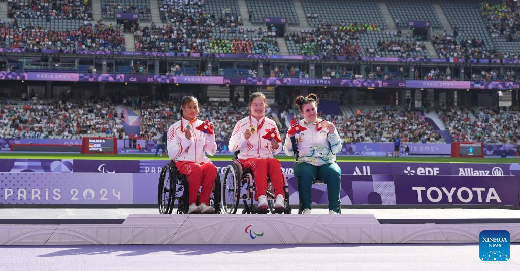 PARIS, 2 septiembre, 2024 (Xinhua) -- La medallista de oro Zou Lijuan (c) y la medallista de plata Zuo Caiyun (i) de China, la medallista de bronce Dayna Crees de Australia posan para fotografías durante la ceremonia de premiación del lanzamiento de jabalina de F34 femenino de para atletismo en los Juegos Paralímpicos de París 2024, en París, Francia, el 2 de septiembre de 2024. (Xinhua/Cai Yang)