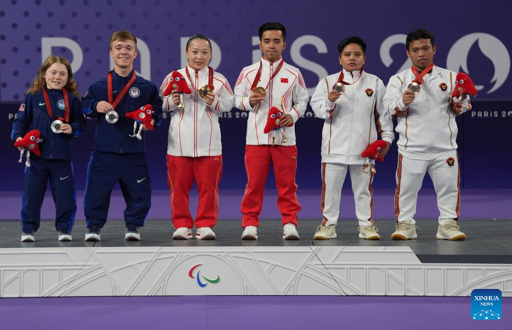 PARIS, 2 septiembre, 2024 (Xinhua) -- Los medallistas de oro Lin Naili (3-d)/Li Fengmei (3-i) de China, los medallistas de plata Miles Krajewski (2-i)/Jayci Simon (i) de Estados Unidos y los medallistas de bronce Subhan Subhan (d)/Rina Marlina de Indonesia posan para una fotografía grupal durante la ceremonia de premiación del partido de dobles mixtos SH6 de para bádminton en los Juegos Paralímpicos de París 2024, en París, Francia, el 2 de septiembre de 2024. (Xinhua/Xing Guangli)