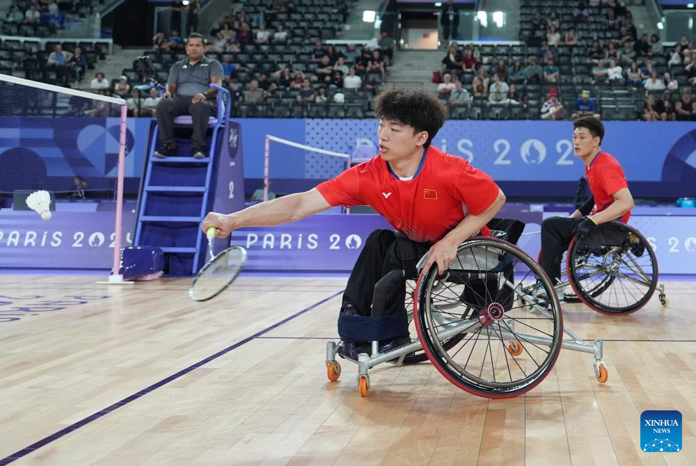 PARIS, 2 septiembre, 2024 (Xinhua) -- Imagen del 1 de septiembre de 2024 de Mai Jianpeng (d)/Qu Zimo de China compitiendo durante el partido por la medalla de oro de WH1-WH2 dobles masculinos de para bádminton ante Jeong Jaegun/Yu Sooyoung de República de Corea en los Juegos Paralímpicos de París 2024, en París, Francia. (Xinhua/Xing Guangli)