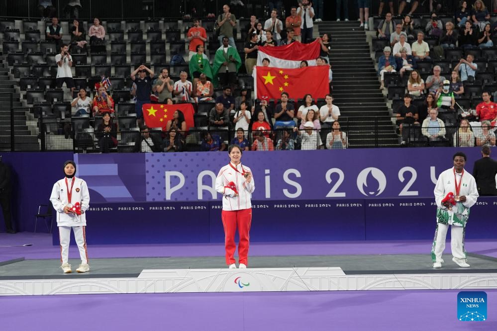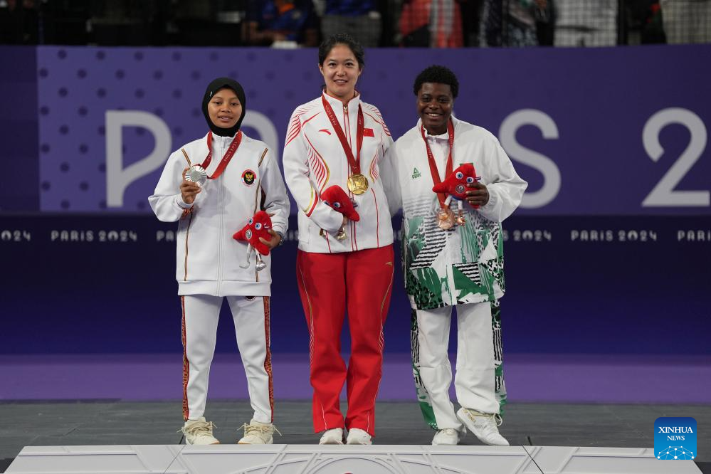 PARIS, 2 septiembre, 2024 (Xinhua) -- La medallista de oro Xiao Zuxian (c) de China, la medallista de plata Qonitah Ikhtiar Syakuroh (i) de Indonesia y la medallista de bronce Mariam Eniola Bolaji de Nigeria reaccionan durante la ceremonia de premiación de individual femenino SL3 de para bádminton en los Juegos Paralímpicos de París 2024, en París, Francia, el 2 de septiembre de 2024. (Xinhua/Xing Guangli)