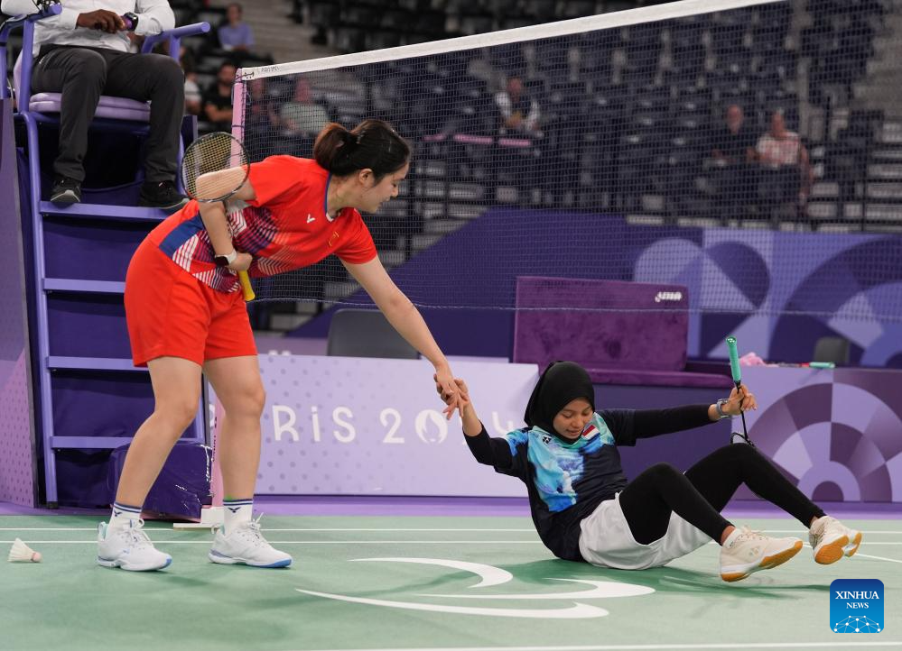 PARIS, 2 septiembre, 2024 (Xinhua) -- Xiao Zuxian (i) de China ayuda a Qonitah Ikhitiar Syakuroh de Indonesia durante el partido por la medalla de oro de individual femenino SL3 de para bádminton en los Juegos Paralímpicos de París 2024, en París, Francia, el 2 de septiembre de 2024. (Xinhua/Xing Guangli)