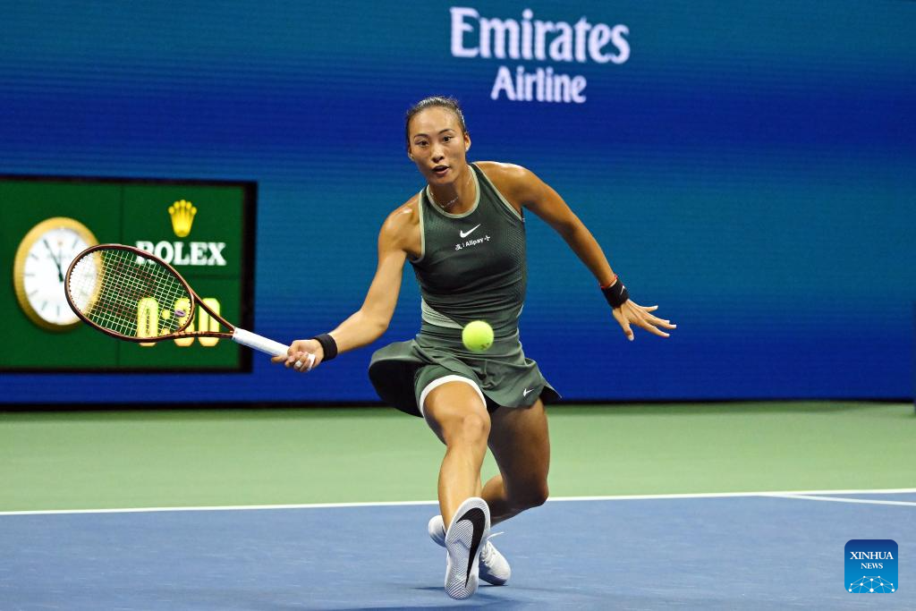 NUEVA YORK, 2 septiembre, 2024 (Xinhua) -- Zheng Qinwen, de China, devuelve la pelota a Donna Vekic, de Croacia, durante el partido de la cuarta ronda de individuales femenino en el campeonato de tenis US Open 2024, en Nueva York, Estados Unidos, el 2 de septiembre de 2024. (Xinhua/Li Rui)
