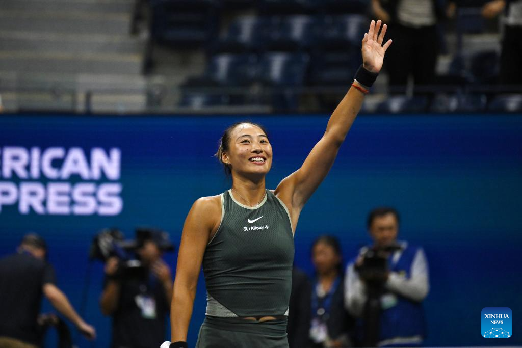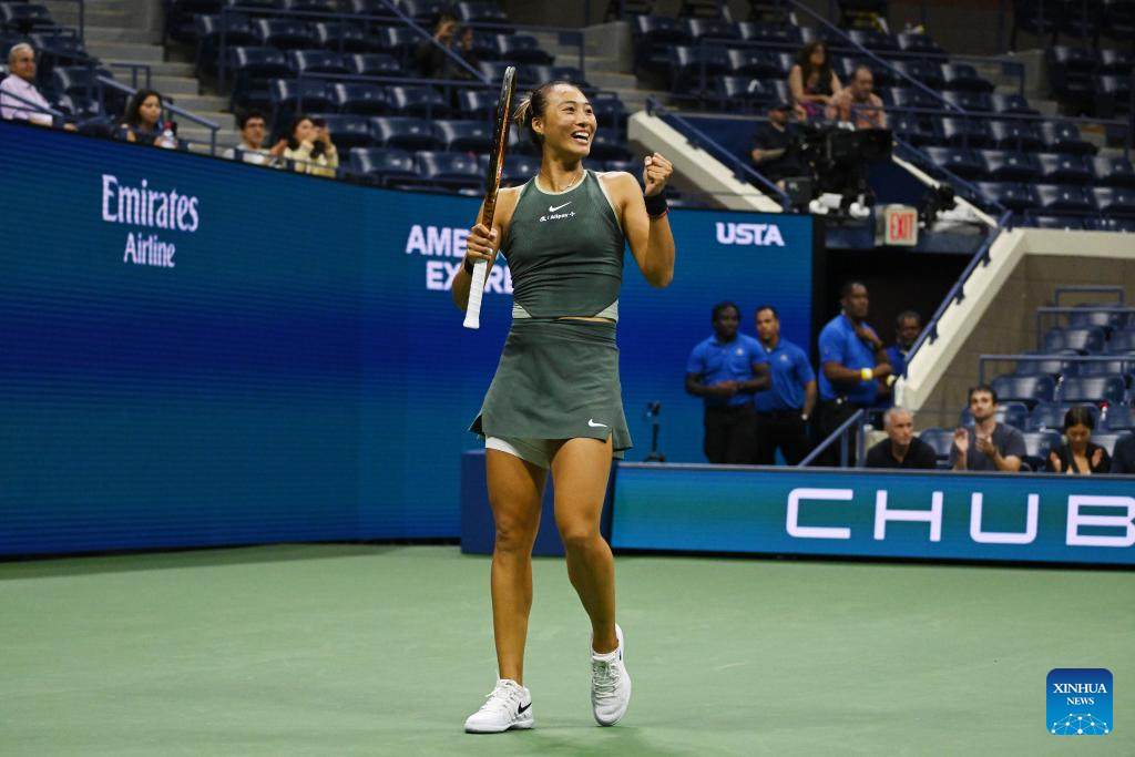 NUEVA YORK, 2 septiembre, 2024 (Xinhua) -- Zheng Qinwen, de China, festeja tras derrotar a Donna Vekic, de Croacia, después del partido de la cuarta ronda de individuales femenino en el campeonato de tenis US Open 2024, en Nueva York, Estados Unidos, el 2 de septiembre de 2024. (Xinhua/Li Rui)