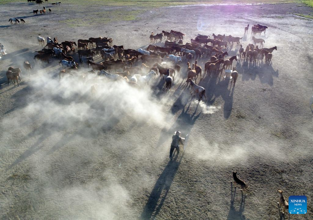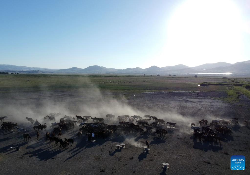 KAYSERI, 2 septiembre, 2024 (Xinhua) -- Vista aérea tomada con un dron el 1 de septiembre de 2024 de una manada de caballos salvajes en el Parque Nacional Sultan Reedy, en Kayseri, Turquía. (Xinhua/Mustafa Kaya)