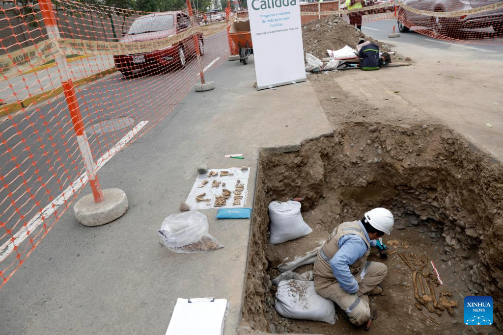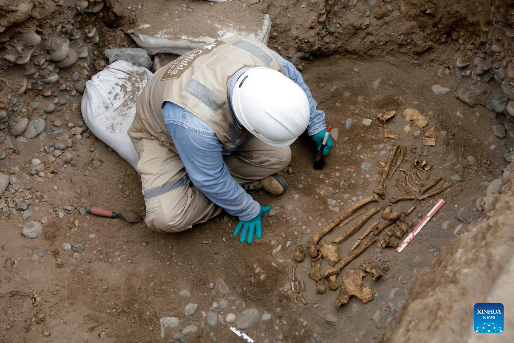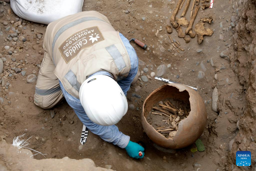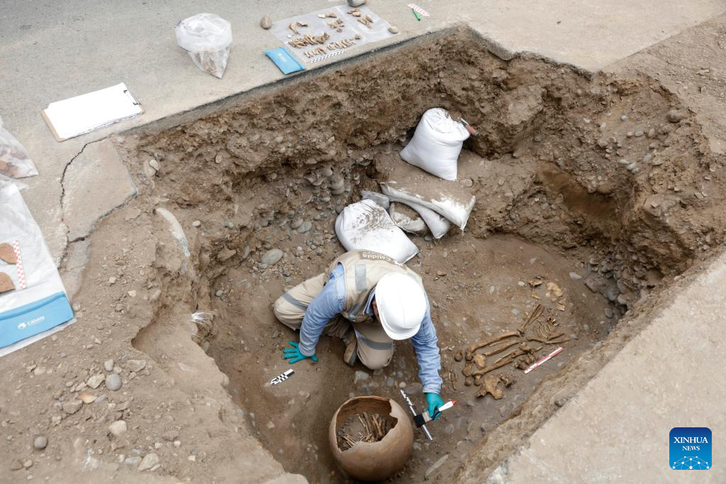 LIMA, 3 septiembre, 2024 (Xinhua) -- Rodrigo Salaverry, arqueólogo de la empresa peruana de gas natural Cálidda, realiza la limpieza de restos arqueológicos de la cultura lima encontrados en una avenida mientras la empresa realizaba trabajos de instalación de tuberías, en el distrito de Miraflores, en Lima, Perú, el 3 de septiembre de 2024. (Xinhua/Mariana Bazo)