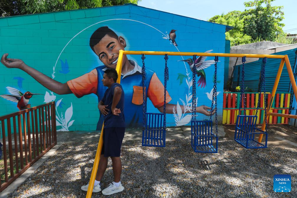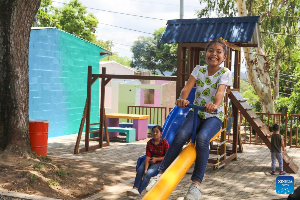 SAN SALVADOR, 3 septiembre, 2024 (Xinhua) -- Una niña juega en un parque durante un recorrido para mostrar la rehabilitación de espacios de diversión, viviendas y pasajes de la colonia La Campanera, en la municipalidad de Soyapango, en el departamento de San Salvador, El Salvador, el 3 de septiembre de 2024. (Xinhua/Alexander Peña)
