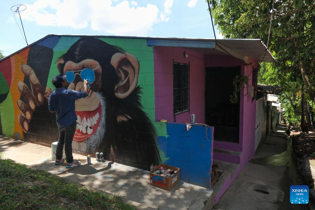 SAN SALVADOR, 3 septiembre, 2024 (Xinhua) -- Un joven pinta un mural durante un recorrido para mostrar la rehabilitación de espacios de diversión, viviendas y pasajes de la colonia La Campanera, en la municipalidad de Soyapango, en el departamento de San Salvador, El Salvador, el 3 de septiembre de 2024. (Xinhua/Alexander Peña)