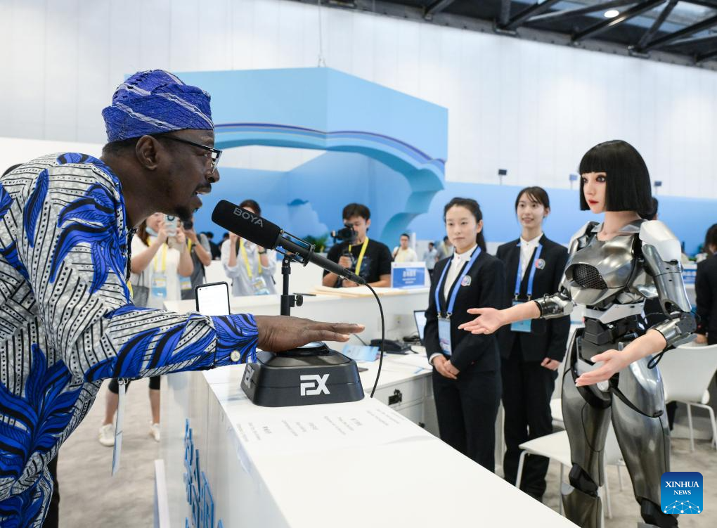 BEIJING, 3 septiembre, 2024 (Xinhua) -- Un periodista africano interactúa con un robot en el centro de medios para la Cumbre 2024 del Foro de Cooperación China-África (FOCAC, por sus siglas en inglés), en Beijing, capital de China, el 3 de septiembre de 2024. (Xinhua/Li He)