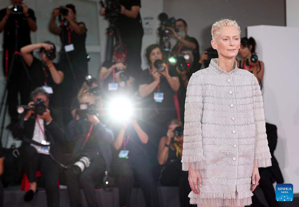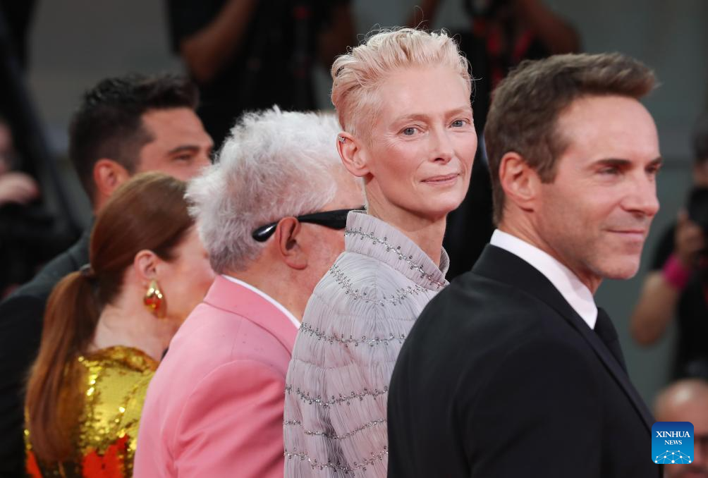 VENECIA, 3 septiembre, 2024 (Xinhua) -- Imagen del 2 de septiembre de 2024 de la actriz, Tilda Swinton (2-d), vista en la alfombra roja previo al estreno de la película "The Room Next Door" durante el 81 Festival Internacional de Cine de Venecia, en Venecia, Italia. (Xinhua/Li Jing)